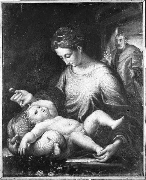 - NOTIZIE STORICO CRITICHE Delle composizioni simili si trovano a Dijon (Musée des Beaux-Arts, n. 193, olio su tavola), Firenze (Galleria Corsini), Brussels (Fierez, vendita 5 agosto 1929, olio su tavola), Parma, (Palazzo Borri, olio su tavola), Potsdam (Sanssouci Gallery, n. 159), Sotheby's (27 luhglio 1966, olio su tela) e Milano (Mercato).\nUna variante di autore sconosciuto si trova in Collezione Pourtalés.\nAltre derivazioni dall'originale del Bedoli si trovano a Bergamo (Accademia Carrara, Mazzola Bedoli Girolamo, Madonna con Gesù Bambino e San Bruno, n. 531disegno a penna e inchiostro bruno su carta giallognola), a Windsor (Royal Library, Mazzola Bedoli Girolamo, Testa di Gesù Cristo in tondo, n. 2032, disegno a penna e inchiostro su carta grigia) e a Chatsworth (Duke of devonshire Collection, Mazzola Bedoli Girolamo, Madonna con Gesù Bambino e un Santo presso una porta, n. 803, disegno a carboncino rosso).\nUn'altra derivazione è un'incisione di Sadeler Aegidius (Madonna della Rosa, Vienna Graphisce Sammlung, Albertina).