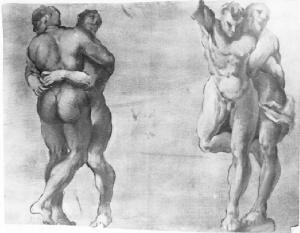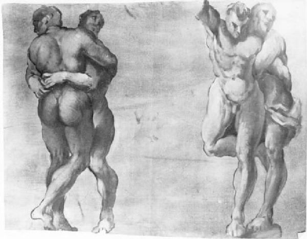 Due coppie di lottatori ignudi: i due a sinistra sono abbracciati l'uno di fronte all'altro, nella coppia di destra l'uno avvinghia l'altro alle spalle.