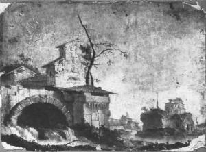 A sinistra rovine di una casa, con ponte ad arco ribassato e un fiume; dietro la casa un albero spoglio; a destra, in secondo piano, le rovine di un castello.