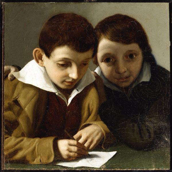 - NOTIZIE STORICO CRITICHE Allievo di Giuseppe Diotti. Nei verbali della Commissione si legge: "riscontrò pregj... distinti per ritenerlo assai commendevole ravvisandovi correzione somma nel disegno, modo il più bello nella sua composizione ed una assai bella varietà nelle tinte". Non è possibile un'identificazione certa dei due fanciulli: il primo presenterebbe una notevole somiglianza con Enrico Scuri (all'epoca ventinovenne) e il secondo ricorderebbe nei lineamenti Luigi Trécourt.
