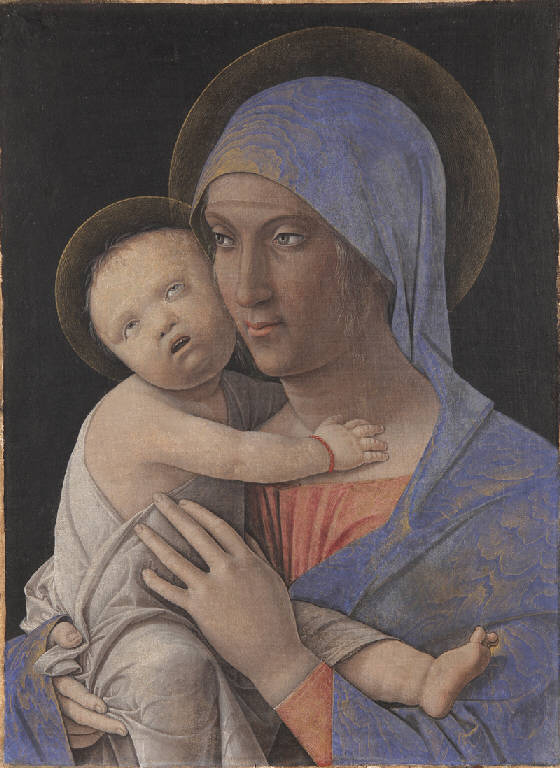 - NOTIZIE STORICO CRITICHE Già citata in collezione Marenzi nel 1824, l'opera giunse in Accademia Carrara con il legato di Carlo Marenzi nel 1851. Destinato alla devozione privata, il piccolo dipinto fu eseguito con una particolare tecnica, estremamente fragile, indicata come "tempera magra". A differenza delle opere dipinte con le più resistenti tecniche a olio o a tempera classica, il dipinto presenta una tela finissima, preparata solo con una leggera apprettatura, e il colore è composto da un legante magro che crea superfici chiare e porose, che non prevedono una verniciatura finale. La materia pittorica, opaca, rende la solida e netta forma delle due figure, mentre la lucentezza dei colori è affidata alla preziosità delle materie pittoriche, come il lapislazzuli per l'azzurro del manto e l'oro per la marezzatura della seta. Il dipinto, straordinariamente rifinito, presenta un 'immagine affettuosa e al tempo stesso severa dell'abbraccio tra la Madre e il Bambino. Il braccialetto di corallo indossato dal Bambino, la sua espressione patetica e l'indefinibile sguardo della Madonna, dal volto di ritratto, prefigurano la Passione e la Morte di Gesù. Lo stretto legame tra le due figure ricorda ancora gli studi padovani su Donatello. A causa della sostanziale continuità dello stile di Andrea Mantegna, giunto giovanissimo alla piena maturità espressiva, l'opera è di difficile definizione cronologica: i critici l'hanno collocata variamente, dall'inizio del periodo mantovano (dal 1460, G. Paccagnini, in "Andrea Mantegna", 1961), al periodo della Camera degli Sposi (1465-1474, De Nicolò Salmazo, 2004), a fine carriera (1485-1495, Longhi, 1962, Lightbowm, 1986). Ultimamente G. Agosti (in "Mantegna 1431-1506", 2008, p. 44) data il dipinto alla fine degli anni Settanta, avvicinandolo al "Cristo morto" di Brera.\nPrima del recente restauro l'opera, pur non avendo subito nel passato pesanti alterazioni, presentava un allentamento della tela e numerose piccole lacerazioni con cadute diffuse di colore e ridipinture. Ripristinata la solidità del supporto, questo è stata tensionato in maniera misurabile e ragolabile su un nuovo telaio in lega leggera, che costituisce anche parte del contenitore climatizzato, che ne assicura la migliore conservazione nel tempo. Rimosse le stuccature e le connesse ridipinture, l'opera è stata sottoposta a un intervento di reintegrazione pittorica differenziata delle lacune.
