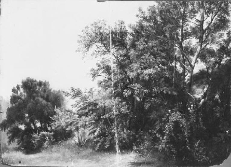 Radura di un bosco con piante d'alto fusto e cespugli a destra; arbusti e fiori a sinistra.