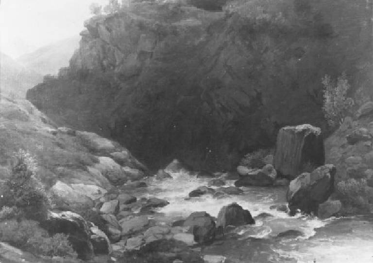 Torrente con rocce e arbusti e montagne sullo sfondo.