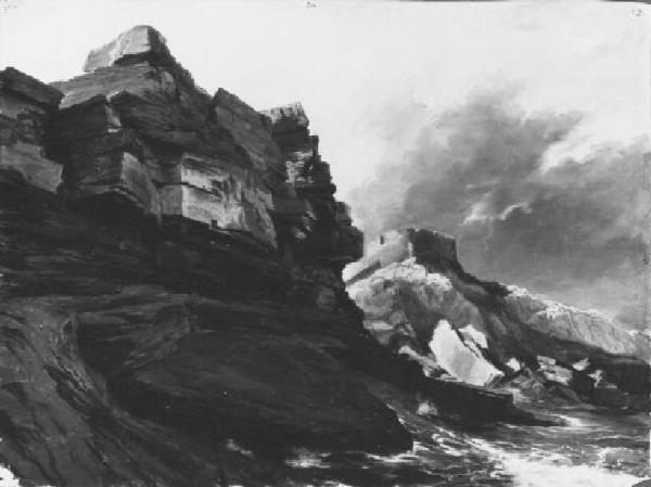 Marina: scogliera con torrione circolare (Porto Venere); fondo: cielo azzurro con nuvole scure.