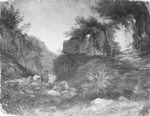 Rupi e rocce con arbusti in una valle; montagna sullo sfondo.