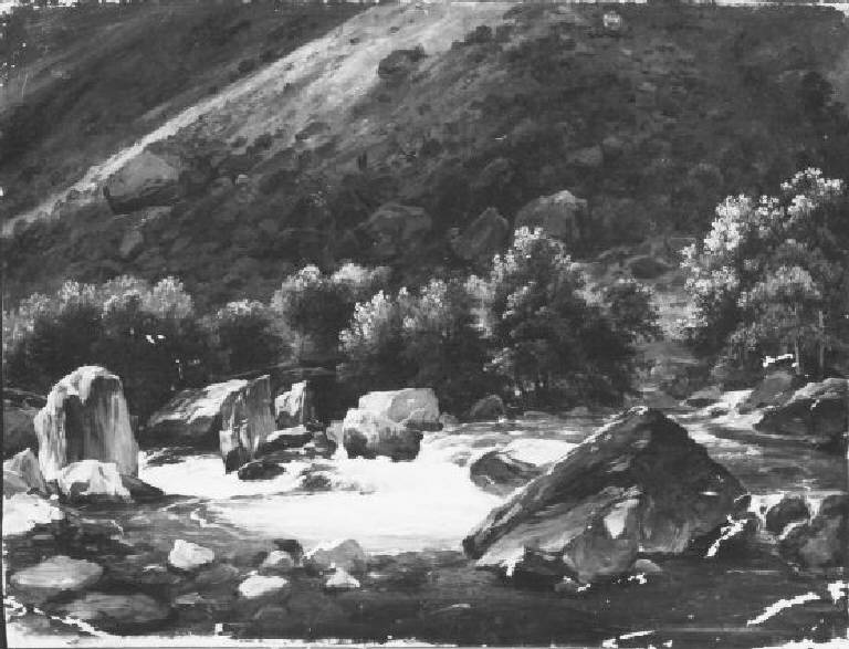 Il corso di un fiume (Serio) fra rocce; sullo sfondo alberi e il pendio di un monte (veduta di Valle Bondione).