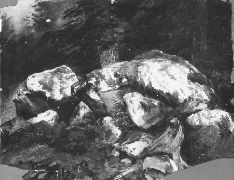 Grandi massi rocciosi con arbusti e tronchi d'albero; abetaia sullo sfondo.