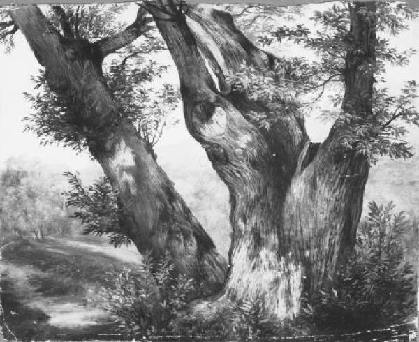 In primo piano due grossi alberi (castagni ?); vallata con alberi sullo sfondo.