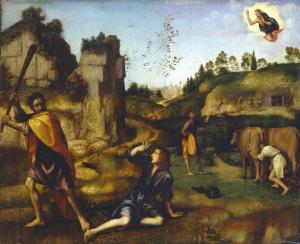 - NOTIZIE STORICO CRITICHE Si tratta dell'episodio di un Ciclo con le Storie della Genesi. Oggetti collegati: Sacrificio di Caino e Abele (Cambridge, Fogg Art Museum, n. 1906.5), quest'opera faceva parte della tavola schedata, poi staccata e immessa separatamente sul mercato; Creazione degli animali, di Adamo e di Eva (London, Courtauld Institute of Art, n. 23), Cacciata dal Paradiso terrestre (Zagreb, Galleria Strossmayr, n. 95): queste tavole probabilmente costituivano una decorazione parietale inserita in una struttura lignea. Dipinto rifatto nel settore in alto a sinistra: al posto della rupe. Il supporto è composto di tre frammenti: in alto a sinistra e lungo il lato. La cornice risale al secolo XX ed è in legno sagomato dorato.