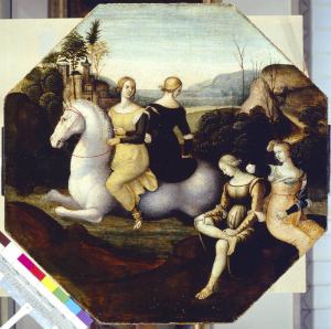 - NOTIZIE STORICO CRITICHE Si tratterebbe di un pannello decorativo di un soffitto a cassettoni ottagonali (e non come si pensava in passa di un desco da parto). Secondo le fonti, Clelia traversò il Tevere a nuoto, non a cavallo, tale iconografia si diffonde agli inizi del '500. La cornice in legno modanato dorato risale al secolo XIX.