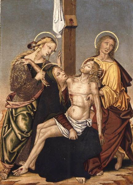 - NOTIZIE STORICO CRITICHE Si tratterebbe del recto di uno stendardo processionale eseguito per la Confraternita di Sant'Andrea di San Lorenzo in Doliolo, il cui verso raffigurante i Santi Lorenzo e Andrea è conservato a Roma, presso la Galleria Nazionale (le due facce dello stendardo vennero separate, secondo Rossi, dal vescovo di Sanseverino Giacomo Ranghiasci). Il disegno della veste della Maddalena e del manto è inciso. Cornice del secolo XVI, originale, legno dipinto, modanato, lavoro a pastiglia.