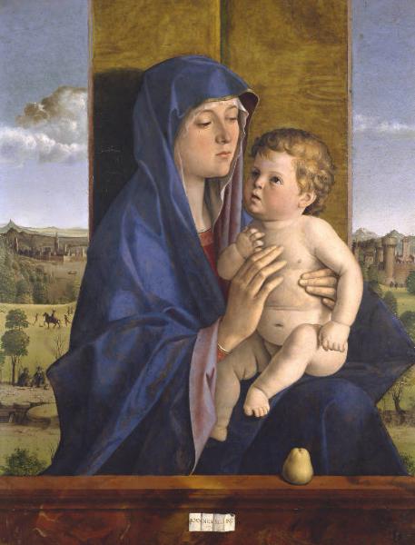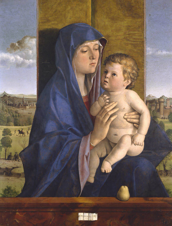 - NOTIZIE STORICO CRITICHE Il dipinto proviene dall'altare della Immacolata Concezione nella chiesa di S. Maria della Pace ad Alzano Lombardo, dove fu visto da Carlo Ridolfi e documentato da padre Donato Calvi nel XVII secolo. Poiché la cappella dell'Immacolata Concezione era di patronato di Pietro Camozzi Gherardi, è stato ipotizzato che il dipinto appartenesse in origine a Lucrezia Agliardi Vertova, con questi imparentata, presso la cui famiglia alla metà del Cinquecento vi era una copia del dipinto, eseguita da Giovan Battista Moroni (Rossi 1994). Dopo la soppressione del convento con l'annessa chiesa e vari ulteriori passaggi l'opera fu acquistata nel 1872 da Giovanni Morelli per il cugino Giovanni Melli che alla morte, l'anno successivo, lasciò in eredità l'opera allo stesso Morelli. La firma, orgogliosamente posta nel cartiglio sul parapetto in primo piano, è autografa e nessuno ha messo in discussione la paternità di Giovanni Bellini, tranne che per la porzione a sinistra del paesaggio riferita da alcuni ad aiuti di bottega. Fra le varie ipotesi critiche sulla datazione dell'opera ha prevalso una cronologia alla seconda metà degli anni Ottanta del Quattrocento per le affinità con il "Trittico dei Frari" del 1488 e con alcuni dipinti conservati alle Gallerie dell'Accademia come la "Sacra Conversazione" Venier, la "Madonna dei cherubini rossi" e la "Madonna degli Alberetti", datata 1487. Come in queste opere e in particolare nella "Madonna dei cherubini", le figure non sono più collocate parallelamente alla superficie pittorica ma in posizione angolare una rispetto all'altra a sottolineare la profondità prospettica. Le forme sono semplificate e i volumi hanno una maggiore evidenza tridimensionale, mentre il paesaggio, acutamente descritto nei particolari con influssi fiamminghi forse da Van Eyck,, è intriso di luce solare che lo rende limpido e sereno. Il supporto è costituito da due pannelli in legno di pioppo.