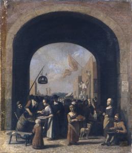 - NOTIZIE STORICO CRITICHE Oggetti collegati: Scena popolare. Probabile significato moralistico, nel confronto con il pendant. Il dipinto era stato precedentemente ritenuto la rappresentazione di una scena di mercato. La scritta sul manifesto dello stipite destro dell'arco risale al secolo XVII. Firmato. La rappresentazione risente degli influssi del fratello più giovane dell'artista Gerrit Adriaensz.