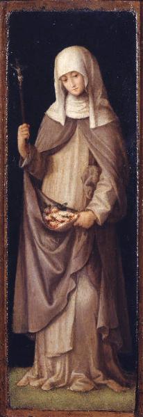 - NOTIZIE STORICO CRITICHE Si tratta dello sportello di destra di un trittico o altarolo portatile. Complesso di origine ignota. Già ritenuta Santa Dorotea o Santa Rosa. L'impianto della figura serba un preciso ricordo dei moduli di Defendente Ferrrari, mentre la parte superiore della figura ha punti di tangenza con l'arte nordica, in un impasto di impressioni e stili caratteristico del Cinquecento piemontese (Zeri/Rossi).