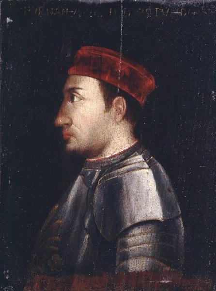 - NOTIZIE STORICO CRITICHE La scritta in giallo risale al secolo XVI. Gia' ritenuto ritratto di Bartolomeo Colleoni (1933, Lendorff); il soggetto è in realtà precisato dall'iscrizione in alto e il ritratto deriva dal sepolcro marmoreo nella chiesa di Santa Maria delle Grazie a Monterotondo. Privo di cornice.