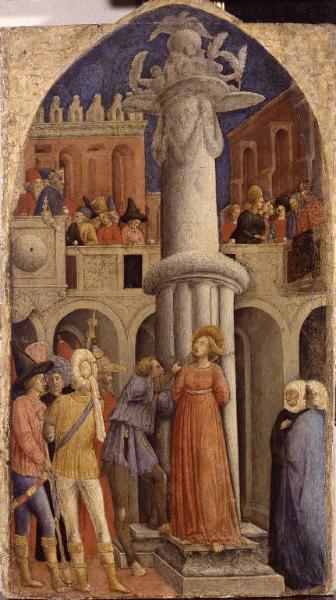 • NOTIZIE STORICO CRITICHE Faceva parte del Polittico del Martirio delle Vergini (smembrato). Oggetti collegati: Sant'Apollonia accecata (Bergamo, Accademia Carrara, num. inv. 58AC00014), Martirio di una Santa (Bassano, Museo Civico), Santa Caterina abbatte un idolo pagano (Washington, National Gallery of Art, Kress Collection). Il Re, il carnefice e vari soldati sono stati sfregiati. Il supporto è in legno di quercia. L'attribuzione dell'opera e del dipinto num. inv. 58AC00014 a Giovanni d'Alemagna è stata recentemente ribadita da Boskovits (2003) e da Valagussa (2010).