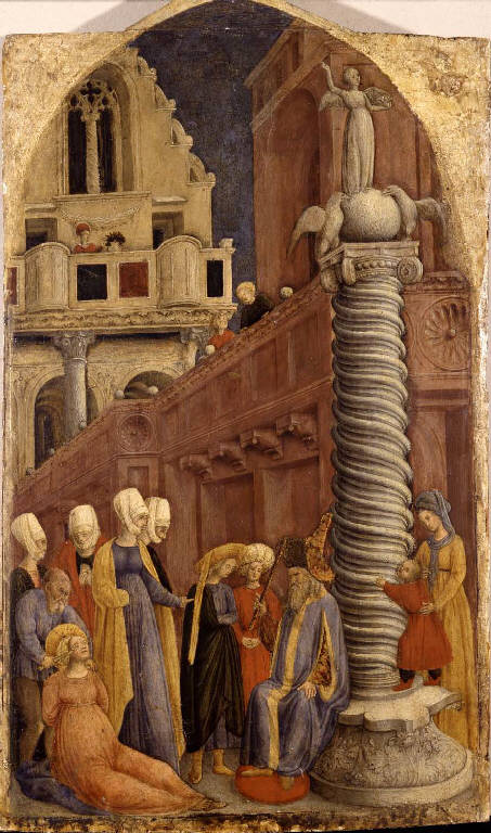 - NOTIZIE STORICO CRITICHE Faceva parte del Polittico del Martirio delle Vergini (smembrato). Oggetti collegati: Martirio di S. Apollonia (Bergamo, Accademia Carrara, num. inv. 58AC00015), Martirio di una Santa (Bassano, Museo Civico), Santa Caterina abbatte un idolo pagano (Washington, National Gallery of Art, Kress Collection). Il volto del Sacerdote è stato sfregiato. Il supporto è in legno di quercia. L'attribuzione dell'opera e del dipinto num. inv. 58AC00015 a Giovanni d'Alemagna è stata recentemente ribadita da Boskovits (2003) e da Valagussa (2010).