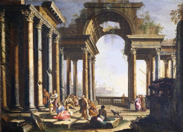 - NOTIZIE STORICO CRITICHE Fa parte di un pendant disperso raffigurante "Scene con rovine classiche". Oggetti collegati: "Architettura con macchiette" (num. inv. 58AC00835). E' probabile che si tratti di una predica di San Paolo, sullo sfondo un porto di mare, forse il porto di Cesarea.