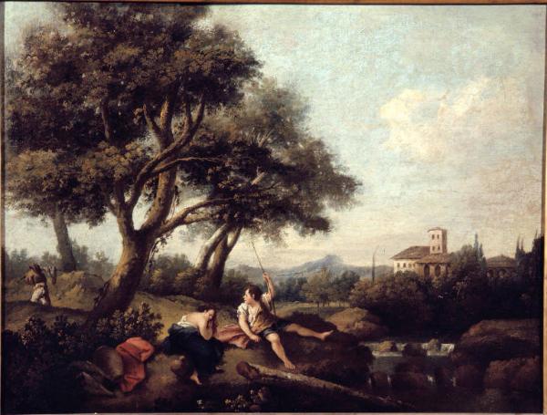 - NOTIZIE STORICO CRITICHE Opera pervenuta in Accademia Carrara con legato Francesco Galliccioli del 1906. Fa parte di una serie di paesaggi con scene campestri probabilmente eseguiti intorno al 1770-1780. Oggetti collegati: "Paesaggio con cavalieri che attraversano un fiume" (num. inv. 58AC00770), "Paesaggio con pastori" (num. inv. 58AC00772) e "Paesaggio con lavandaie" (num. inv. 58AC00773).