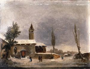 Veduta di un borgo con chiesa sotto la neve
