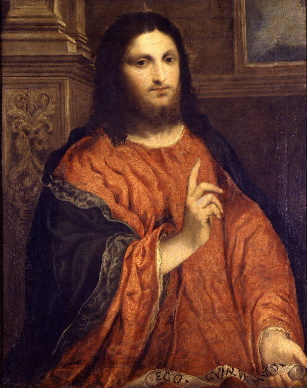- NOTIZIE STORICO CRITICHE Opera pervenuta in Carrara a seguito del legato di Maria Ricotti Caleppio del 1908 con l'attribuzione a Rocco Marconi. Con ogni probabilità il prototipo dell'opera in esame è conservato a Londra (National Gallery, inv. 1845) mentre copie sono conservate presso l'abbazia di Polirone e in Francia (Autun, Musée Rolin). L'iscrizione presente nel cartiglio in basso fa riferimento al Vangelo di Giovanni (VIII, 12). Nicolas Penny (2008) ritiene che il soggetto raffigurato non sia "Cristo benedicente" ma "Cristo come lux mundi".