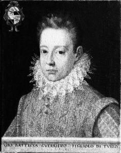- NOTIZIE STORICO CRITICHE Fa parte di una serie di ritratti della famiglia Guerrieri (nn. inv. 58AC00430, 58AC00431, 58AC00432, 58AC00433, 58AC00434). Oggetti collegati: "Ritratto di Francesca Guerrieri Gonzaga", "Ritratto di Alfonso Guerrieri", "Ritratto della contessa Giulia Brembati Guerrieri" e "Ritratto del conte Vincenzo Guerrieri". Già identificato come Rodolfo Guerrieri. Giovani Marenzi ereditò l'opera prima del 1921.