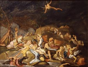 - NOTIZIE STORICO CRITICHE Opera pervenuta in Accademia Carrara con lascito Carlo Ceresa del 1924. Il dipinto, chiamato anche "Diluvio universale", è stato recentemente datato al 1675-1678 ca. da M. Binotto ("La pittura nel Veneto. Il Seicento", 2000) e da G. Valagussa al 1675 ca. ("I grandi veneti", 2010).\nL'opera è stata esposta ad una mostra intitolata probabilmente "La Fine del Mondo e il Principio della Speranza" a Zurigo nel Kunsthaus Zurich nel 1999.