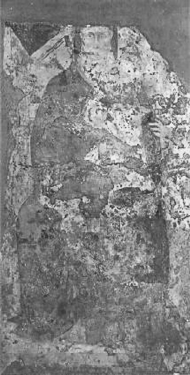 - NOTIZIE STORICO CRITICHE L'opera, depositata da Ubi Banca all'Accademia Carrara nel settembre del 1915, si trova al Palazzo della Ragione, Sala delle Capriate. Insieme ai dipinti "Papa Urbano V con le teste di San Pietro e San Paolo" (restituito a Ubi Banca), "Sant'Antonio Abate" (restituito a Ubi Banca), "San Domenico" (restituito a Ubi Banca), "Cristo in pietà", "Madonna con Bambino in trono","Santa monaca e volto di Cristo", "Madonna del Latte" (restituito a Ubi Banca), "Madonna con Bambino in trono con angeli reggicortina" (restituito a Ubi Banca), "San Sebastiano" (restituito a Ubi Banca), "Sant'Anna Metterza e San Giacomo il Maggiore" (restituito a Ubi Banca), "Santa Maria Maddalena" (restituito a Ubi Banca), "Santa Marta e donatore" (restituito a Ubi Banca), "San Marco e Santa Elisabetta" (restituito a Ubi Banca), "Madonna con Bambino in trono, San Bartolomeo, Santo Stefano e il donatore Bertolo de' Zorli" (restituito a Ubi Banca), "San Giacomo il Maggiore" (restituito a Ubi Banca), "Epigrafe di Bertolo de Zorli" (restituito a Ubi Banca), "San Giovanni Battista", "San Martino e monaca domenicana", fa parte del ciclo di affreschi provenienti dal Monastero di S. Marta.\nNel 1915 iniziarono i lavori relativi alla ristrutturazione del monastero di S. Marta, finanziati dalla Banca Popolare di Bergamo e seguiti dall'ing. Luigi Angelini. Il 30 aprile dello stesso anno vennero ritrovati degli affreschi nelle pareti sud-est della chiesa. I dipinti, staccati da Mauro Pelliccioli a spese della Banca, furono subito dati in deposito all'Accademia Carrara. Dall'elenco ne risultavano diciannove.\nIl ciclo di affreschi, spettante a mani diverse, è collocabile in un arco di tempo che va dal sesto al nono decennio del Trecento, benchè il nucleo più significativo sia vincolato al 1377, anno di dedicazione della chiesa, e al 1370 post, anno di morte di papa Urbano V raffigurato in uno degli affreschi. Un'iscrizione sepolcrale dipinta, recante la data 1388, si assume come punto di riferimento per una "Madonna in trono con San Bartolomeo, Santo Stefano e donatore".