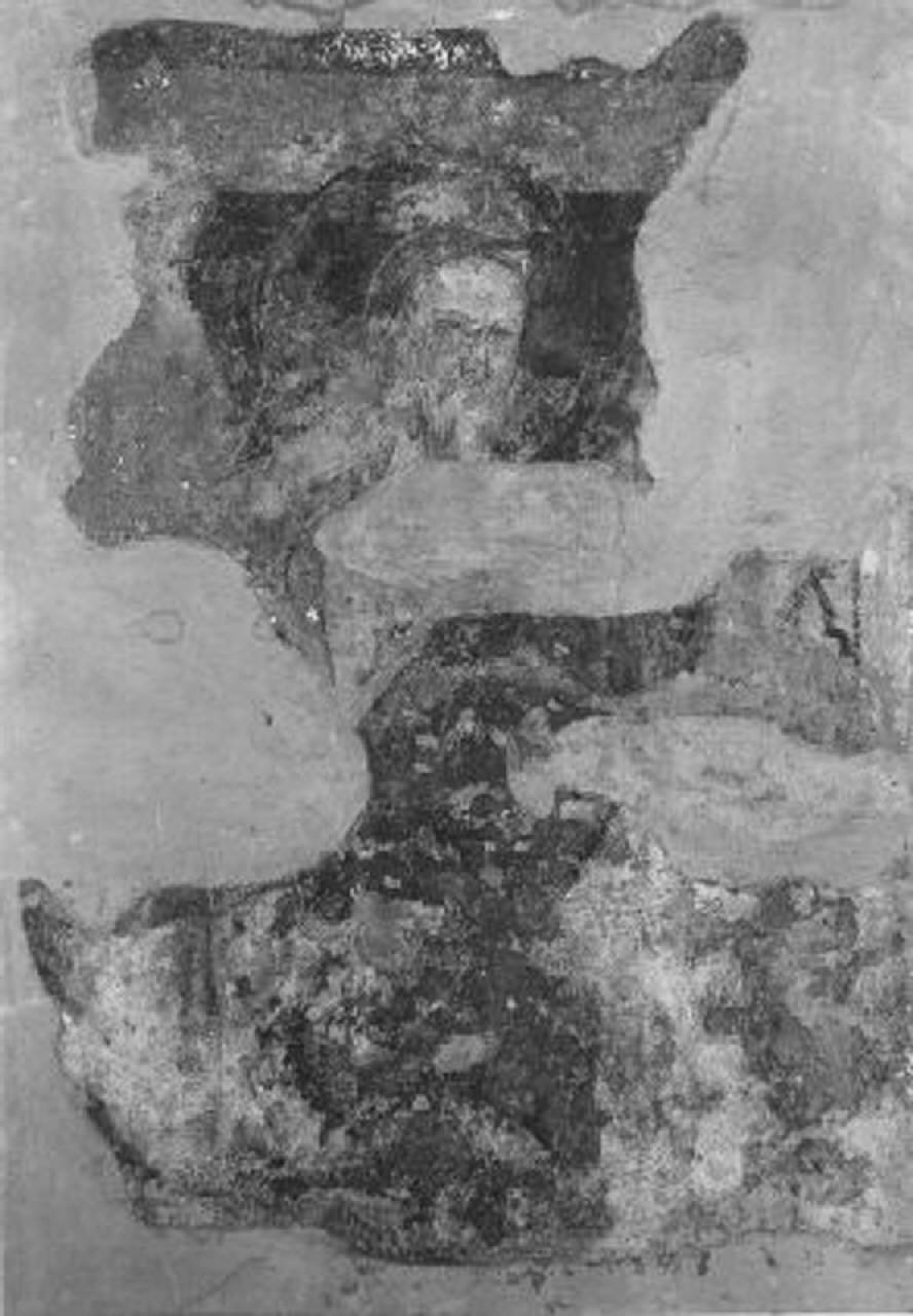 • NOTIZIE STORICO CRITICHE Della decorazione ad affresco della chiesa di S. Antonio in Foris si conservano diciassette dipinti trasportati su tela con supporto rigido, ed uno in loco, nella lunetta del portale laterale murato della ex chiesa. Il dipinto in esame, strappato nel 1955 e donato al Comune di Bergamo dal Sig. Bonimi nello stesso anno, è stato depositato all'Accademia Carrara nel 1985. Ora si trova in deposito presso il Palazzo della Ragione, Sala delle Capriate insieme ad altri nove affreschi ("Madonna del Latte e Santa", "Sante", "Natività di Gesù", "Santo diacono con libro", "San Bartolomeo", "Sant'Antonio Abate", "Sant'Antonio Abate", "Madonna con Bambino in trono e Sant'Antonio Abate" e "Madonna con Bambino in trono con Santi e angeli"). I restanti sette dipinti ("San Giovanni Battista", "Testa di Santo barbuto", "Testa di Santo", "Fregio", "Figura con manto panneggiato", "Santo (?)" e "Fregio" si trovano ancora all'Accademia Carrara.