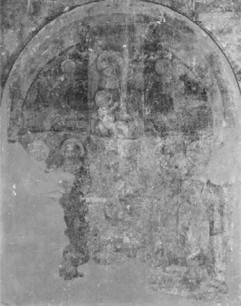 - NOTIZIE STORICO CRITICHE Della decorazione ad affresco della chiesa di S. Antonio in Foris si conservano diciassette dipinti trasportati su tela con supporto rigido, ed uno in loco, nella lunetta del portale laterale murato della ex chiesa. Il dipinto in esame, strappato nel 1955 e donato al Comune di Bergamo dal Sig. Bonimi nello stesso anno, è stato depositato all'Accademia Carrara nel 1985. Ora si trova in deposito presso il Palazzo della Ragione, Sala delle Capriate insieme ad altri nove affreschi ("Madonna del Latte e Santa", "Sante", "Cristo", "Santo diacono con libro", "San Bartolomeo", "Sant'Antonio Abate", "Sant'Antonio Abate", "Madonna con Bambino in trono e Sant'Antonio Abate" e "Natività di Gesù"). I restanti sette dipinti ("San Giovanni Battista", "Testa di Santo barbuto", "Testa di Santo", "Fregio", "Figura con manto panneggiato", "Santo (?)" e "Fregio") si trovano ancora all'Accademia Carrara.