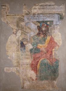 - NOTIZIE STORICO CRITICHE Insieme agli affreschi "Filosofo Epimenide", "Filosofo greco e architettura", "Filosofo (?)", "Stemma gentilizio della famiglia Badoer", "Colonnato", "Colonnato", "Architettura con capitello", "Cornicione con fregio", "Architravi e oculo", "Architettura", "Architettura con iscrizione" e "Architettura", il dipinto è un frammento del complesso decorativo della facciata del Palazzo del Podestà di Bergamo. Si trova in deposito presso il Palazzo della Ragione, Sala delle Capriate.\nA sinistra non più leggibile ma testimoniata doveva esserci la scritta CHILON LACEDEMON.