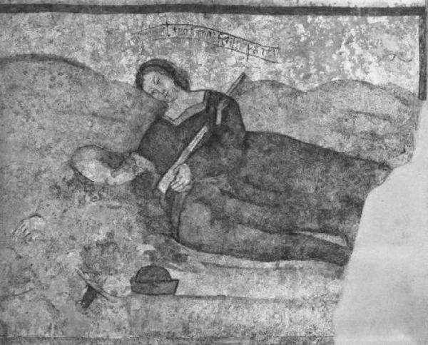 - NOTIZIE STORICO CRITICHE Il dipinto è stato strappato da muro e riportato su tela in epoca imprecisata. Insieme ad altri cinque affreschi raffiguranti "Figura maschile e lepre", due "Fregi vegetali", una "Caccia alla lepre" e un "Paesaggio con cane", proviene da una casa privata di Almenno San Bartolomeo. Si trova in deposito nella Sala dei Giuristi nel Palazzo del Podestà di Bergamo. La scritta nel cartiglio in alto è illeggibile.