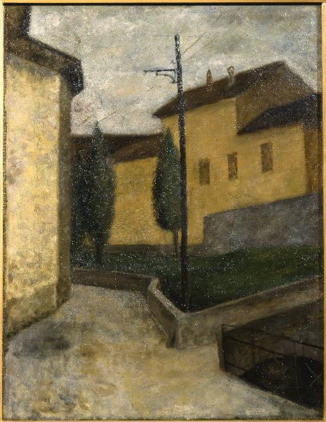 - NOTIZIE STORICO CRITICHE Allievo di Contardo Barbieri. Questa veduta cittadina è stata dipinta dall'artista al verso della tela con la quale ha vinto il concorso del 1937; l'opera dimostra una chiara affinità con la produzione vedutista del maestro. Finito l'alunnato in Carrara lavora presso gli studi dell'Arzuffi e del Marigliani, dai quali impara ad affrescare, attività che caratterizza la sua carriera di artista. Solo alla fine degli anni Sessanta si dedica esclusivamente alla pittura da cavalletto, grazie alla quale è apprezzato dal grande pubblico.