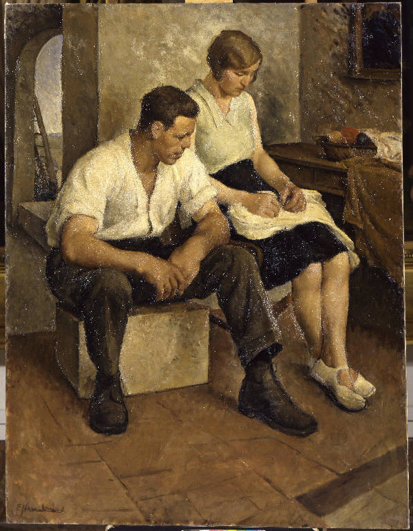 - NOTIZIE STORICO CRITICHE Allievo di Contardo Barbieri. L'opera è direttamente confrontabile con quella della Sibella, di analogo tema (cfr. 58EL00112). Nembrini si concentra maggiormente sull'analisi dello spazio nel quale agiscono le figure, disposte lungo la diagonale che taglia la stanza da un angolo all'altro; in fondo a sinistra il vano si apre sull'esterno lasciando intravedere un piccolo brano di paesaggio, secondo una tradizione antica; e ancora colpisce la cura del dettaglio (come fa notare Valagussa) con la parca distribuzione di alcuni oggetti e mobili che connotano l'ambiente. Nembrini svilupperà la propria carriera pittorica nell'ambito della decorazione di edifici sacri.