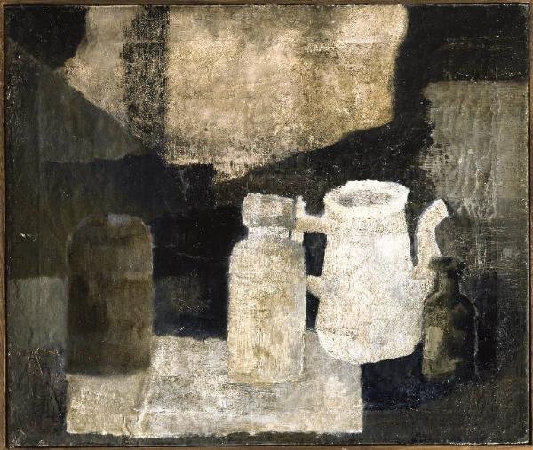 - NOTIZIE STORICO CRITICHE Allievo di Trento Longaretti. Labaa si diploma presso l'Accademia Carrara nel 1965, dopo aver vinto un certo numero di premi e ottenuto riconoscimenti; nel '74 si laurea in Architettura presso il Politecnico di Milano. Risulta quindi agli occhi della critica una personalità versatile, con una piccata attitudine per l'analisi dello spazio e delle forme, che si dispongono in esso. In questa natura morta Labaa non pone alcuna attenzione al colore, scegliendo un tono bruno come elemento portante, sul quale spiccatamente biancheggiano alcuni elementi: la brocca, la bottiglia, la tovaglietta. L'effetto generale è quello di un disegno o di una stampa più che di un dipinto, lasciando intendere che la vera analisi riguarda le forme, gli spazi e la luce, nell'ottenimento di un tutto armonico e realistico, che colore a parte, può ricordare certe composizioni di Cezanne, come Natura morta con vaso caffettiera e frutta. Valagussa nota come in questo contrasto bianco/nero, in cui sono eliminate le sfumature chiaroscurali, gli oggetti abbiano quasi l'effetto di una tarsia marmorea corrosa dal tempo, secondo l'uso di quegli anni di recupero degli oggetti come relitti di memoria.