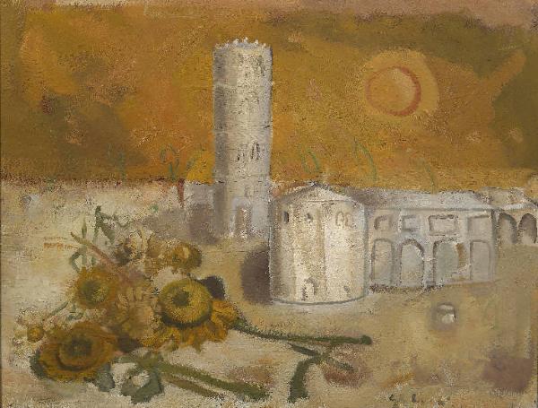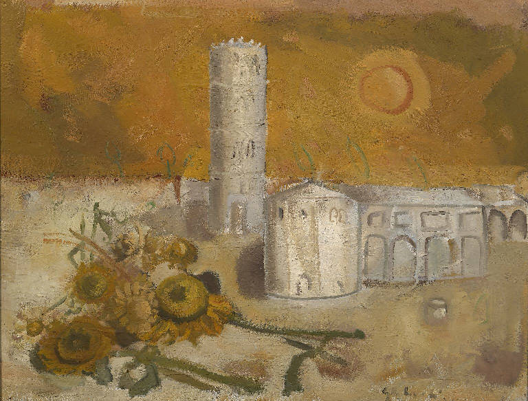 - NOTIZIE STORICO CRITICHE Allievo di Trento Longaretti. Tra il 1962 e il 1965 Ghilardi realizza tre ritratti schedati rispettivamente ai numeri 06EL00137, 06EL00144, 06EL00154. Quest'opera, che esula per soggetto dal campo in cui si vedeva impegnato l'artista con esiti discreti, risulta più debole, non tanto nella realizzazione della natura morta in primo piano costituita da girasoli e margherite, che è in perfetta scala cromatica col colore del cielo e che spicca evidente sul ripiano bianco, ma piuttosto nella definizione dell'architettura che è il vero soggetto del dipinto e che non riesce a spingersi oltre la mera esercitazione scolastica, senza infamia e senza lode, così come quel monocorde cielo ocra, nel quale il sole cerchiato occhieggia le forme dei fiori adagiati in primo piano.