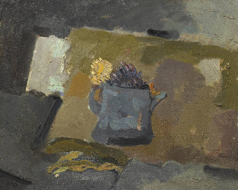 - NOTIZIE STORICO CRITICHE Allievo di Trento Longaretti. Si diploma presso l'Accademia Carrara nel 1973. Giovane artista molto dotato, prima di terminare i corsi nel 1971, realizza una personale a Seriate e vince numerosi premi. Nel 1973 frequenta i corsi di pittura di Mario de Luigi a Salisburgo. Si orienta e si mantiene entro l'aerea espressiva figurativa , con le nature morte, i paesaggi e i tiratti, con accenti intimistici e colori dalle tonalità basse per composizioni essenziali. La sua poetica è già definita in questa natura morta, nella quale dimostra una precisa adesione agli insegnamenti del maestro. Un solo oggetto viene riportato, l'innaffiatoio, vivacizzato dalla presenza di un mazzolino di fiori di campo: pochi colori essenziali si registrano sui toni dell'azzurro, dei grigi e dei verdi bruciati, sui quali naturalmente spicca il piccolo fiore giallo.