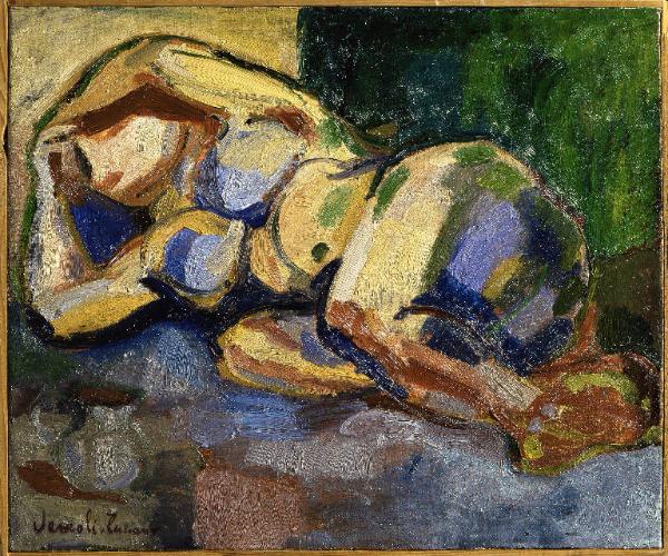 - NOTIZIE STORICO CRITICHE Allievo di Trento Longaretti. Si diploma presso l'Accademia Carrara nel 1978, lo stesso anno in cui esegue questo esercizio di nudo. Nel 2007 la città d'origine, Chiari, gli ha dedicato un'antologica dal titolo "Percorsi di un autore": dalle sue più lontane opere adolescenziali a quelle attuali che si contraddistingono per geometrie spaziali e satellitari. Non è alieno all'Accademia il caso si un nudo sdraiato, ma è assai particolare la vivacità cromatica con cui è realizzato, che si stacca dal dato reale e si autoalimenta dei riflessi degli oggetti circostanti: la parete verde e gialla, il lenzulo azzurro. Una pennellata robusta e materica tornisce in modo abbreviato il corpo robusto della modella, senza riferirne i tratti somatici, ma lasciando all'impressione cromatica il compito di comunicarne l'individualità.