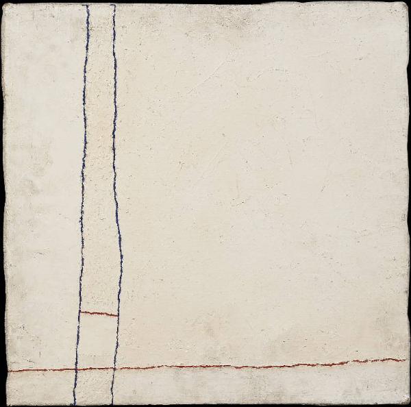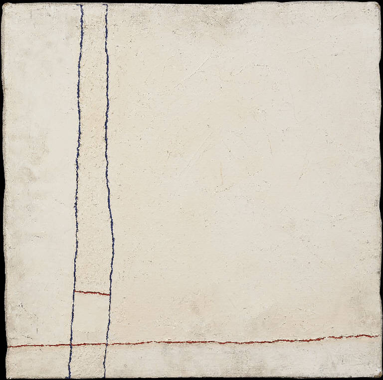 - NOTIZIE STORICO CRITICHE Nulla si sa di Susanna Cristofoletti, nessun dato biografico, nessun riferimento alla sua frequentazione dell'Accademia Carrara. Si può immaginare che, dato il soggetto della composizione, l'opera sia stata realizzata in anni abbastanza recenti, in cui diviene molto più frequente il caso di dipinti a contenuto astratto e sperimentazioni materiche sulle opere, anche se fa un diretto riferimento alla Minimal Art degli anni Sessanta. Questa in particolare è giocata tutta sull'alternanza ritmica tra il vuoto, dato dal bianco costruito con tempera e stucco e sulla materializzazione di un pieno dato dall'attraversamamento in senso verticale e orizzantole, solo su una piccola porzione del dipinto, di linee parallele e perpendicolari blu e rosse, dai caratteri fortemente irregolari, lasciando che il vuoto si sviluppi in una sola dimensione e fornendo una base, un sostegno in quella oppposta. E' un'opera che parla di inizio, di generazione, forse anche di viaggio, del quale però non si vede la fine. Quello che si osserva è solo una parte di un tutto molto più esteso e forse infinito.