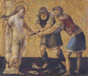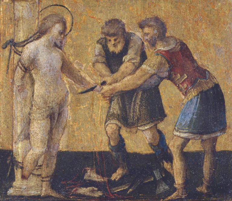 - NOTIZIE STORICO CRITICHE La forma della tavola esclude che potesse trattarsi dello scomparto di predella di un polittico, ma piuttosto sembrerebbe il pannello di un reliquiario o di altra custodia (Rossi). Oggetti collegati: Martirio di San Bartolomeo, Martirio di Sant'Erasmo, Martirio di San Biagio (?): conservati in Accademia Carrara; Madonna in trono con Gesù Bambino tra i Santi Antonio Abate e Giacomo Maggiore, Crocefissione, Martirio di Santo Stefano, Martirio di San Sebastiano: appartengono a una collezione privata inglese, venduti all'asta di Christie's a Londra il 14 giugno 1929, lotto 64; Martirio di San Giorgio (?), Martirio di Santo Vescovo: Firenze, Collezione di Giuseppe Noferi. La cornice in listello ligneo (liscio) dorato risale al secolo XX.