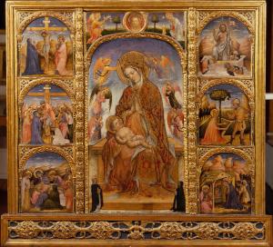 - NOTIZIE STORICO CRITICHE Si tratta di uno scomparto del Trittico Lochis. La cornice originale del XV secolo, con integrazioni nella sagoma interna, è in legno intagliato (con colonnine negli scomparti laterali), modanato, dorato a foglia e dipinto a tempera (con figurazioni) nello scomparto centrale. La tavola è citata da G. Lochis nel 1858 che scrive: "La Beata Vergine col Bambino e sei piccoli quadretti nel contorno, esprimenti fatti scritturali, con cimasa sopra la Beata Vergine. Porta il nome dell'autore". Nel 1864 l'iscrizione apocrifa sullo scomparto centrale era già stata letta da G. Morelli: "Iachomello de / fior. f. - (iscrizione che mi ha l'aria di apocrifa)". L'opera è ritenuta concordemente di Lorenzo di Giacomo, noto anche come Maestro di Ceneda, collaboratore di Jacobello del Fiore, a cui sono state riferite opere già attribuite a Jacobello quali l'"Incoronazione della Vergine" della Cattedrale di Ceneda oggi nelle Gallerie dell'Accademia di Venezia, il polittico di Cellino Attanasio oggi nel Museo dell'Aquila, riferito a Jacobello dal Bologna (1952), e il trittichetto del Municipio di Chioggia con la "Giustizia e Santi".