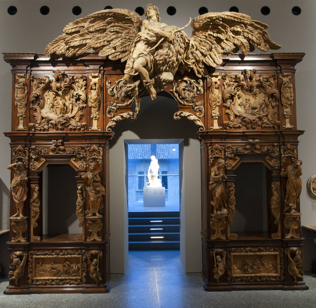 - NOTIZIE STORICO CRITICHE L'alcova fu commissionata alla famiglia Fantoni da Gerolamo Sottocasa fra il 1774 e il 1775 per celebrare due eventi: il conferimento ai Sottocasa del titolo comitale e il matrimonio di Gerolamo con Elisabetta Lupi. La bottega era allora guidata da Grazioso il Giovane che poteva contare sulla collaborazione del figlio Donato Andrea, di cui Gerolamo Sottocasa proprio in quegli anni era protettore e mecenate. A suggerire alla bottega l'apparato iconografico fu lo stesso Gerolamo che, come socio dell'Accademia degli Eccitati di Bergamo, aveva composto molte poesie con diversi riferimenti alla mitologia classica interpretata secondo lo spirito arcadico. Le immagini figurate dell'alcova dovevano illustrare il matrimonio e i valori di moralità su cui doveva fondarsi la famiglia.\nDi grandi dimensioni, l'alcova presenta una struttura rettangolare in legno scuro (noce) con un apparato decorativo e scultoreo suddiviso in tre ordini di scene in legno chiaro di tiglio. Nell'ordine inferiore, affiancati da angioletti con festoni, si trovano i bassorilievi raffiguranti Apollo (che col suono della viola vince la gara col satiro Marsia che suona la rustica siringa di Pan) ed Ercole (che dichiara il suo amore a Onfale, regina di Lidia). In quello superiore, tra dei telamoni, si trovano le allegorie della famiglia Sottocasa: in una si vede il committente contemplare un'aquila ad ali spiegate (l'aquila figurava nel nuovo blasone dei Sottocasa), nell'altra un gruppo di contadini dei feudi agricoli dei Sottocasa portare il tributo al conte. Nell'ordine mediano, a corredo delle cornici semipoligonali a guisa delle finestre aperte, si trovano delle sculture raffiguranti l'allegoria della Notte; quella del Lavoro; quella della Poesia e quella della Matematica, Geometria e Architettura. L'apparato figurativo si conclude sopra l'arco dove è illustrato il mito di Ganimede (è raffigurato il momento in cui l'aquila strappa il giovane cacciatore scelto da Giove come coppiere dell'Olimpo).