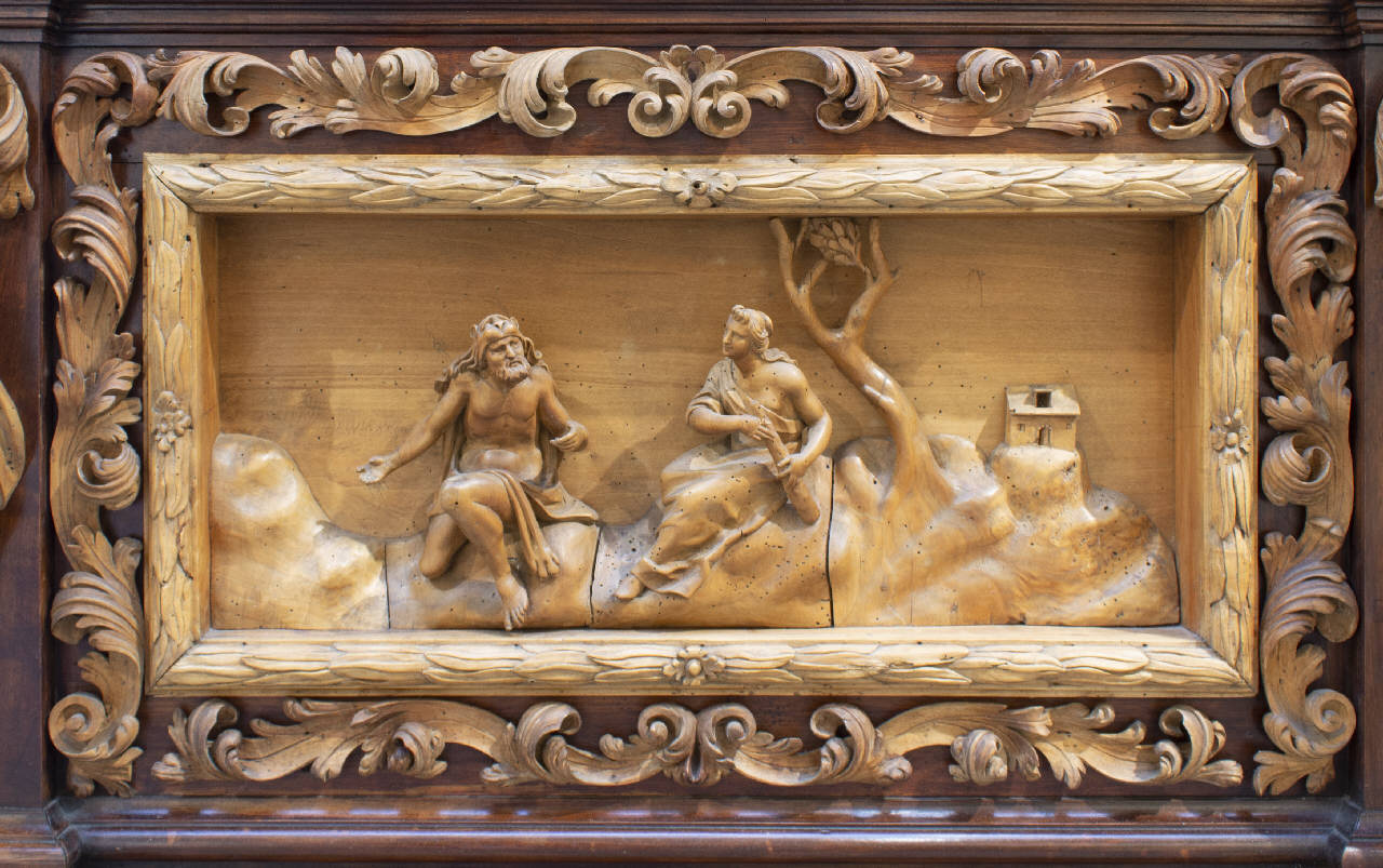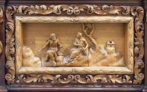 - NOTIZIE STORICO CRITICHE L'alcova fu commissionata alla famiglia Fantoni da Gerolamo Sottocasa fra il 1774 e il 1775 per celebrare due eventi: il conferimento ai Sottocasa del titolo comitale e il matrimonio di Gerolamo con Elisabetta Lupi. La bottega era allora guidata da Grazioso il Giovane che poteva contare sulla collaborazione del figlio Donato Andrea, di cui Gerolamo Sottocasa proprio in quegli anni era protettore e mecenate. A suggerire alla bottega l'apparato iconografico fu lo stesso Gerolamo che, come socio dell'Accademia degli Eccitati di Bergamo, aveva composto molte poesie con diversi riferimenti alla mitologia classica interpretata secondo lo spirito arcadico. Le immagini figurate dell'alcova dovevano illustrare il matrimonio e i valori di moralità su cui doveva fondarsi la famiglia.\nDi grandi dimensioni, l'alcova presenta una struttura rettangolare in legno scuro (noce) con un apparato decorativo e scultoreo suddiviso in tre ordini di scene in legno chiaro di tiglio. Nell'ordine inferiore, affiancati da angioletti con festoni, si trovano i bassorilievi raffiguranti Apollo (che col suono della viola vince la gara col satiro Marsia che suona la rustica siringa di Pan) ed Ercole (che dichiara il suo amore a Onfale, regina di Lidia). In quello superiore, tra dei telamoni, si trovano le allegorie della famiglia Sottocasa: in una si vede il committente contemplare un'aquila ad ali spiegate (l'aquila figurava nel nuovo blasone dei Sottocasa), nell'altra un gruppo di contadini dei feudi agricoli dei Sottocasa portare il tributo al conte. Nell'ordine mediano, a corredo delle cornici semipoligonali a guisa delle finestre aperte, si trovano delle sculture raffiguranti l'allegoria della Notte; quella del Lavoro; quella della Poesia e quella della Matematica, Geometria e Architettura. L'apparato figurativo si conclude sopra l'arco dove è illustrato il mito di Ganimede (è raffigurato il momento in cui l'aquila strappa il giovane cacciatore scelto da Giove come coppiere dell'Olimpo).