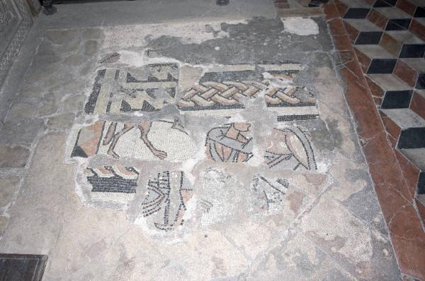 - NOTIZIE STORICO CRITICHE Opera di eccezionale valore storico artistico.\nImportanti frammenti del mosaico tornano alla luce nel 1863 durante la ricognizione delle reliquie dell'altare maggiore, altare che verrà quindi riposizionato, più arretrato, in modo da lasciare parzialmente visibile il litostrato (l'Anno e i mesi di Aprile, Maggio, Marzo, porzione superiore del Labirinto e due animali angolari) mentre altri frammenti di litostrato furono trovati nel 1875 in vari punti del presbiterio, in occasione di lavori di ripristino della sacrestia e del presbiterio, dovuti all'abbassamento del suolo, vengono quindi collocati anteriormente in prossimità della balaustra, sostituita in seguito con transenne recenti.