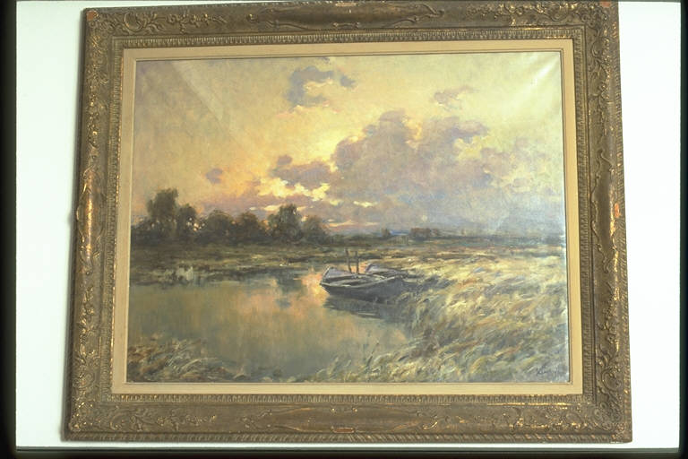Paesaggio lacustre. Lago, alberi, canneto, barche