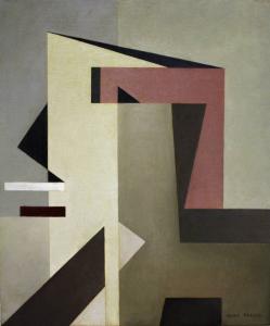 Composizione geometrica astratta, giocata sull'intersezione di forme rettangolari, trapezoidali e triangolari.