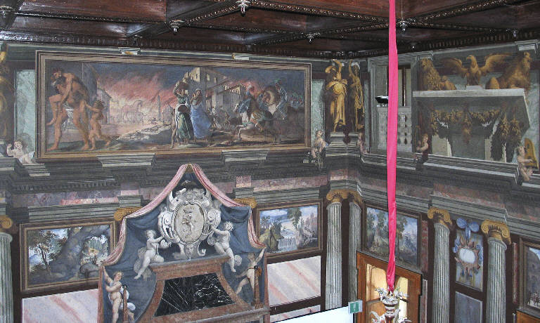 Il salone è interamente affrescato con un finta architettura divisa in due ordini sovrapposti. Quello inferiore, alto fin quasi a due terzi delle pareti, simula una serie di colonne marmoree che sostengono una trabeazione con cornicione aggettante. La scansione della finta architettura si interrompe intorno al camino in marmo presente su uno dei lati corti della sala, che viene incorniciato da dipinti raffiguranti un ampio tendaggio e un grande stemma monocromo, entrambi retti da putti. Lungo le pareti del salone sono dipinti dei finti quadri con paesaggi ideali e, in posizione centrale, scene tratte dalla mitologia classica. Queste ultime rimandano direttamente a Roma, città cara al committente del ciclo, raffigurando Enea e Anchise in fuga da Troia, il Ratto delle Sabine, Muzio Scevola e Orazio Coclite che difende il ponte Sublicio. Lungo il cornicione dell'ordine superiore sono seduti numerosi putti musicanti e si vedono gli animali araldici dei Gallio, aquila e leone. Gli angoli del salone sono scanditi da coppie di cariatidi in finto bronzo.