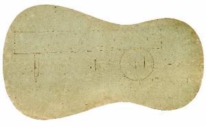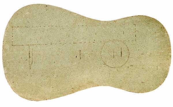 Modello per tavola armonica di chitarra. Vi sono tratteggiate le misure del manico, del foro di risonanza e di parte del ponticello reggicorde. Le due misure a compasso si riferiscono probabilmente all'altezza delle fasce.