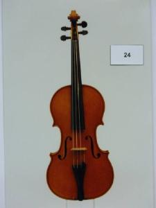 Violino dalle linee eleganti ed equilibrate. Il modello utilizzato per i fori di risonanza e il loro posizionamento abbastanza parallelo sono tipici di questo maestro. Tavola armonica in due pezzi di abete rosso. Fondo in due pezzi di acero con marezzatura ascendente dalla giunta centrale ai bordi. Tavola e fondo presentano lungo la linea di incollaggio con le fasce una sottilissima linea nera di vernice, caratteristica di Fiorini.