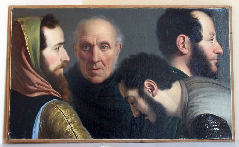 - NOTIZIE STORICO CRITICHE Entrato solo di recente nelle collezioni del Museo Diotti, il piccolo dipinto costituisce uno studio di teste per alcune figure presenti nel Giuramento di Pontida (Casalmaggiore, Palazzo Municipale, sala del consiglio, olio su tela, cm 265 x 375, 1846). \nNella tela sono raffigurati i volti di quattro personaggi di diversa età presentati con differenti posture e caratterizzazioni espressive. Il primo a sinistra è preparatorio per il personaggio stante all'estrema sinistra nel dipinto finale, mentre all'uomo che lo affianca si collega il profilo con la barba all'estrema destra dello "Studio". La figura chinata in avanti si riferisce al deputato colto nell'atto di firmare, mentre la figura di anziano col saio è collegabile all'abate dell'abbazia benedettina di Pontida che nella versione finale tiene tra le mani la bolla Pontificia ed è caratterizzato da una lunga barba.\nDel Giuramento di Pontida Diotti ha realizzato due versioni, la prima nel 1936 (cm 55 x 81, Milano, Galleria di Arte Moderna) e la monumentale versione del 1846, esposta nel Palazzo Municipale di Casalmaggiore, rimasta incompiuta a causa della morte del pittore. Il secondo esemplare presenta alcune varianti nel panno che ricopre il tavolo e nella pergamena che viene firmata. Il soggetto raffigurato è fortemente evocativo delleistanze risorgimentali che si andavano affermando nel corso del XIX secolo.